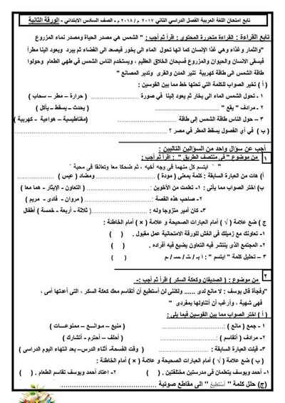 للصف السادس الابتدائي الفصل الدراسي الثاني 2018 تشمل أوراق امتحانات لمدارس